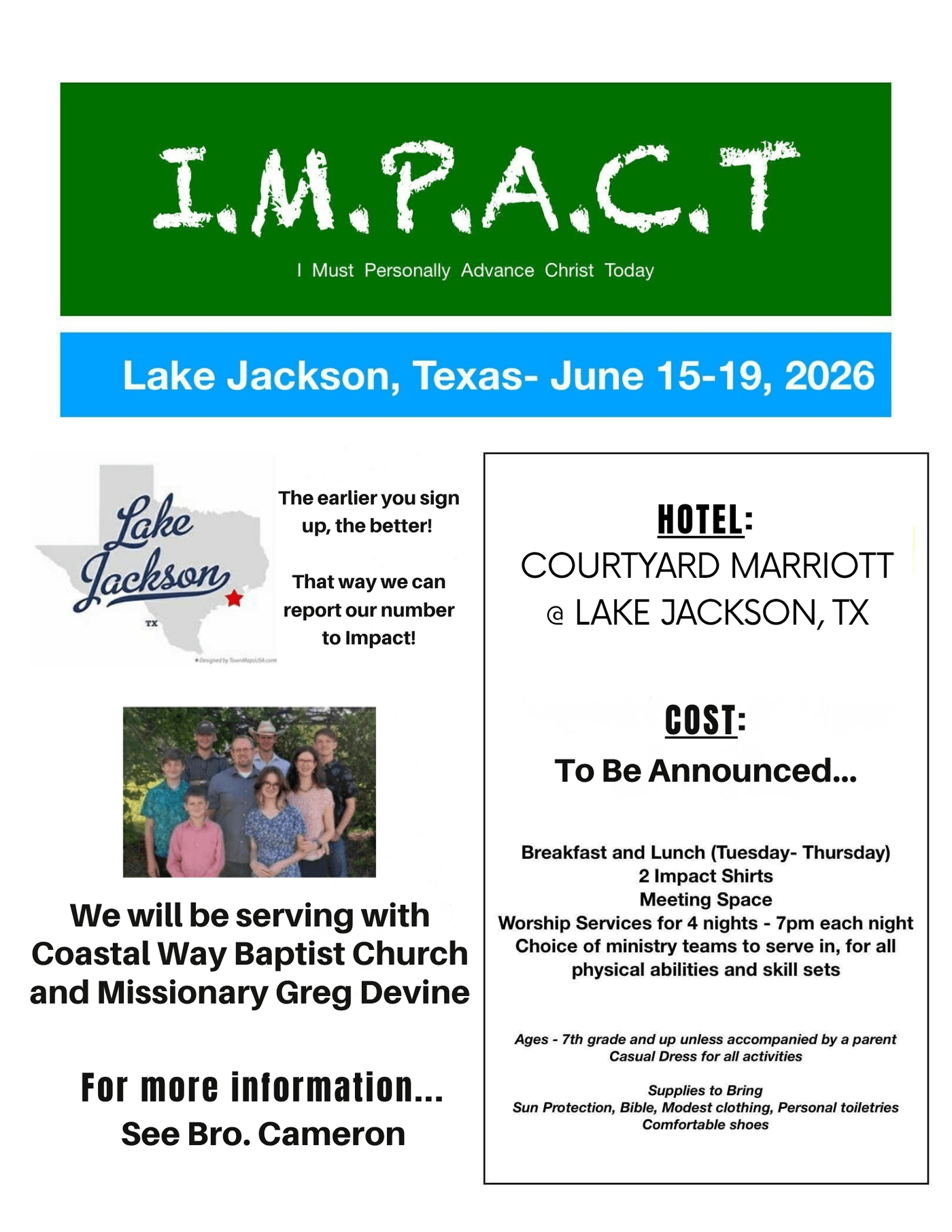 IMPACT stands for I. Must. Personally. Advance. Christ. Today. and is a mission trip opportunity that is organized by Bro. Everett Ledbetter (Missionary to Topeka, Kansas). This year, IMPACT will be in Lake Jackson, TX to work alongside Coastal Way Baptist Church in reaching their community! Don't miss out on this great opportunity to serve!